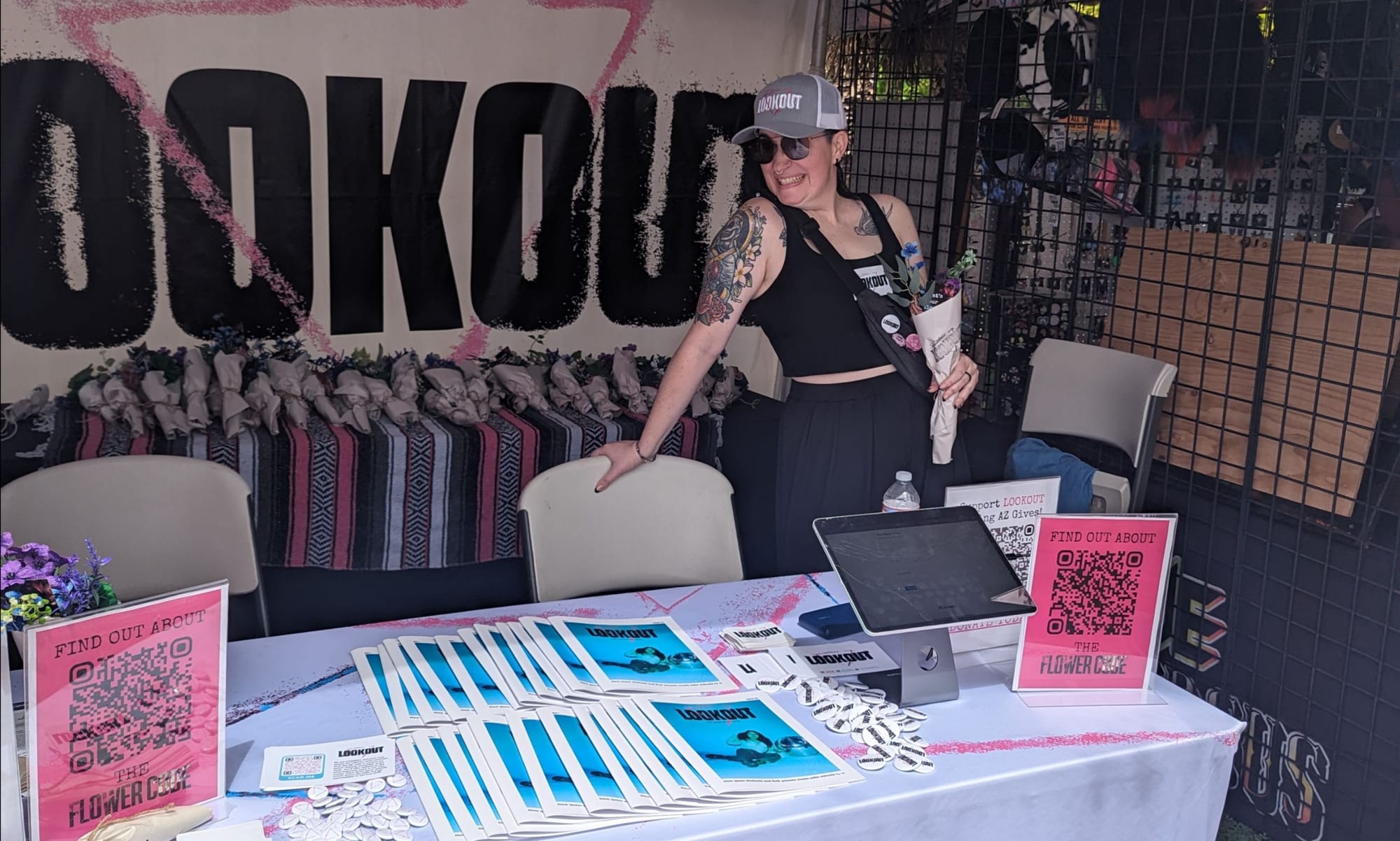 LOOKOUT Board Chair Meg Taylor at Rainbow’s Festival handing out flowers and making people aware of LGBTQ+ news and community.