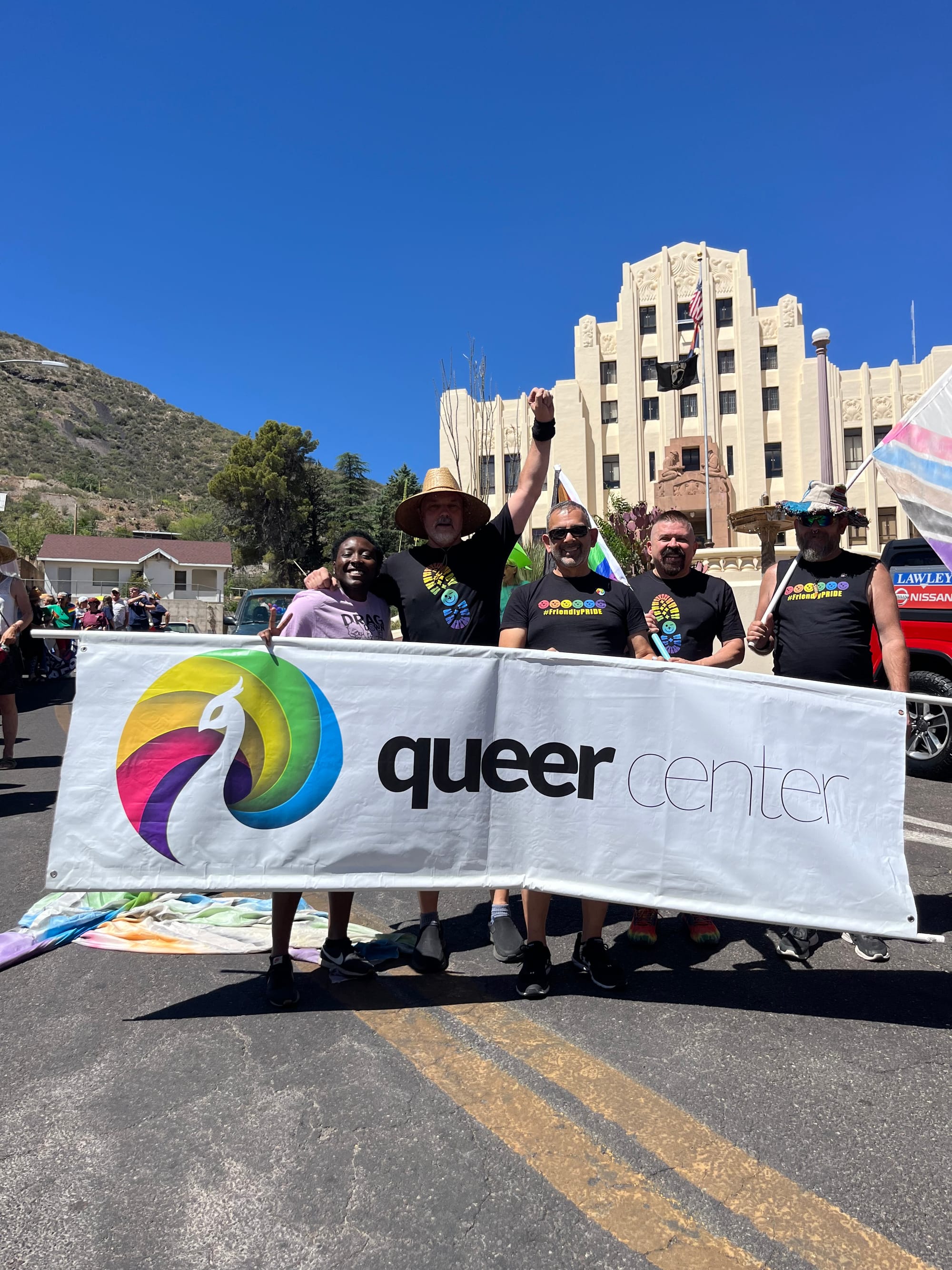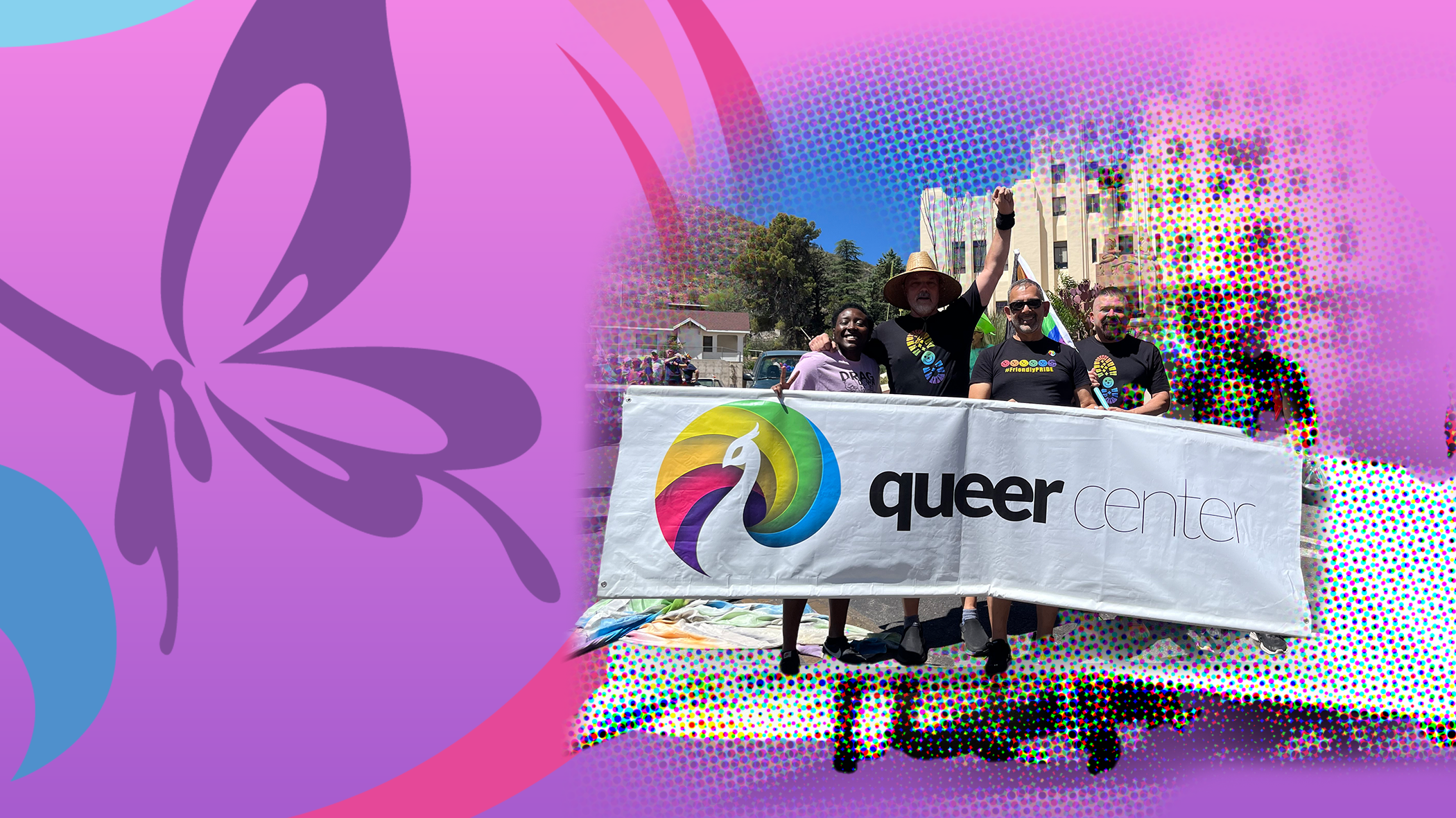 Jay Brown (left) holds the banner for the Queer Center, a local nonprofit that houses LGBTQ+ community groups. (Photo courtesy of Jay Brown)